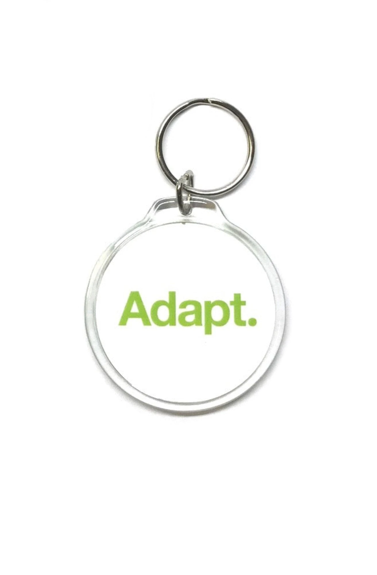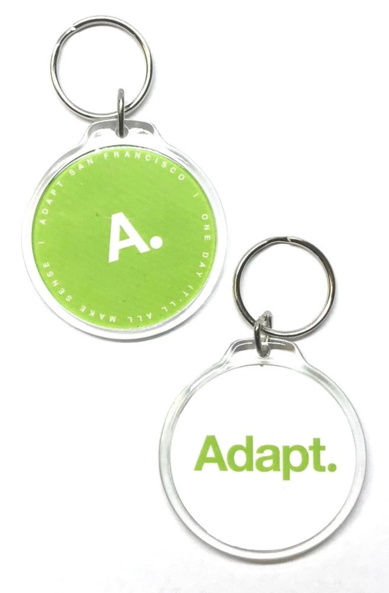 Double-sided clear round keychain. Text around green side reads ‘Adapt San Francisco | One Day It’ll All Make Sense’.