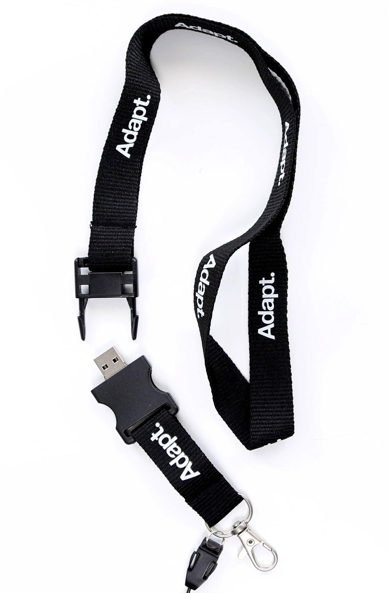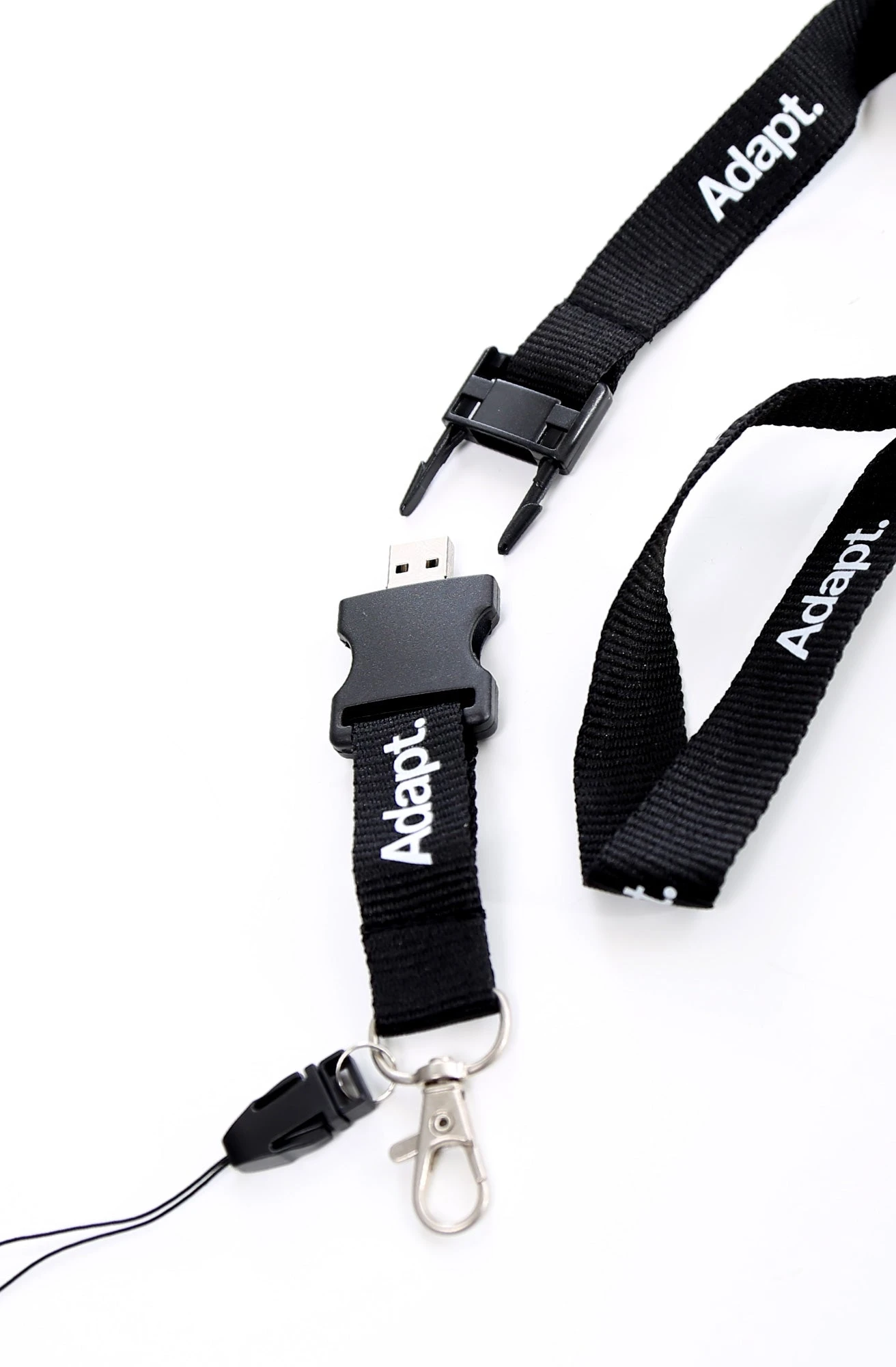 The Adapt CTA USB Lanyard. Yes, it is as useful as it sounds. 4GB Capacity USB drive built into buckle. Durable 3/4″ wide construction, 30″ length. Includes all the other necessities as well — buckle, swivel clasp and detachable cell phone loop.