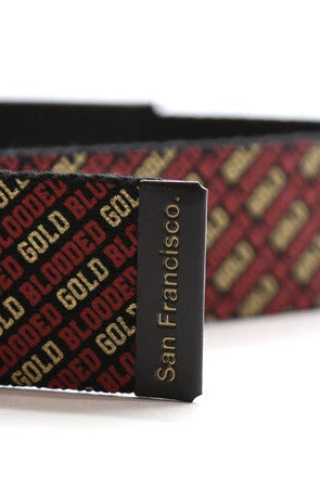 The Gold Blooded Belt–Keep your pants on. Features super-sturdy metal closure with debossed Adapt CTA logo. Gold Blooded red/metallic gold repeating graphic along webbing. One size fits most. Belt can be cut down and resized to accommodate your excess length preference. Metal end closure reads ‘San Francisco’.