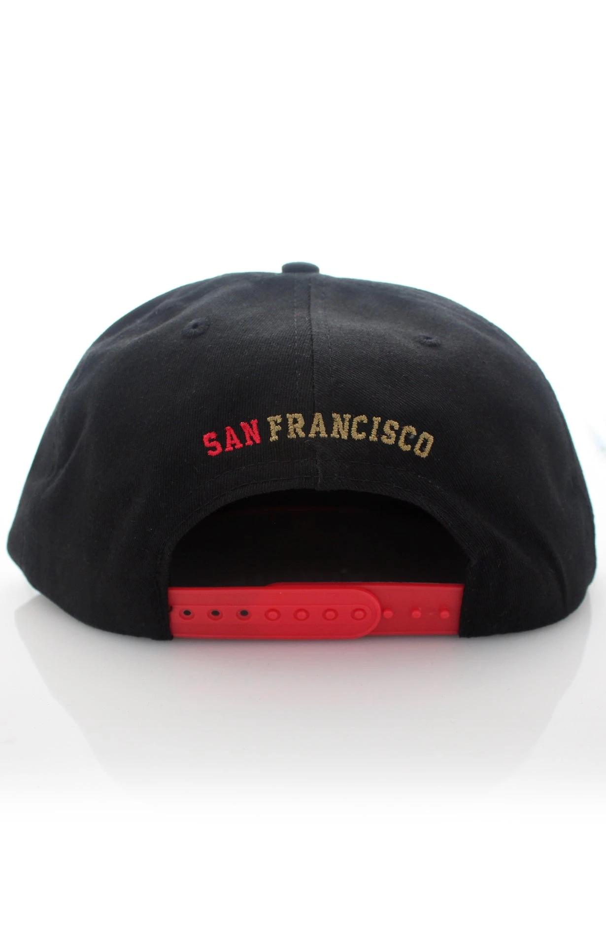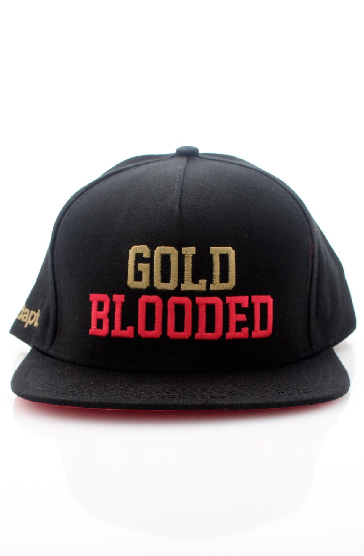 The Gold Blooded Snapback. Very comfortable and just the right fit. Features all black cotton upper with ‘Gold Blooded’ stitching across front, arched ‘San Francisco’ across back, and Adapt CTA Logo on right side. Red underbill and red snap closure.
