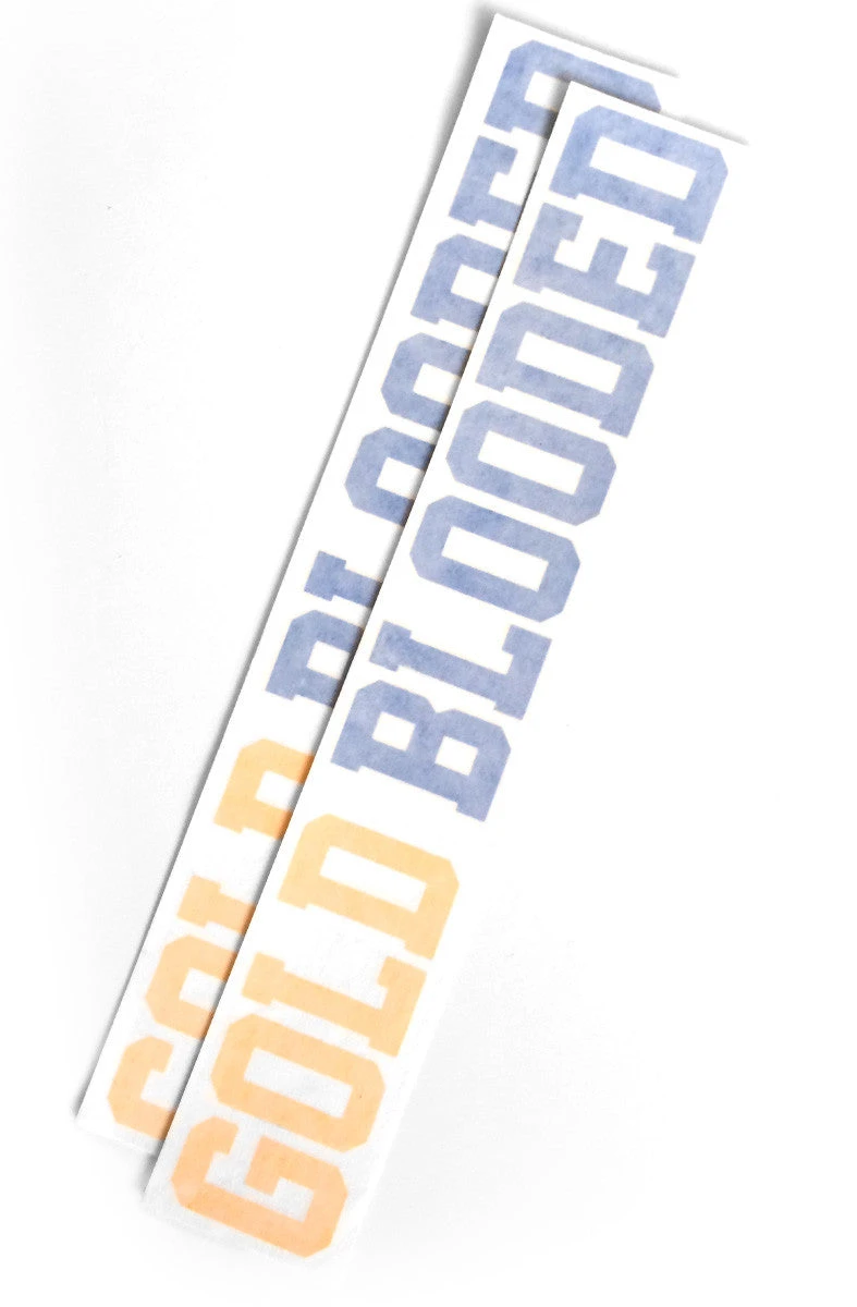 The Gold Blooded 12″ Vinyl Sticker 2-Pack. Two stickers measuring 1-foot wide each. Made for indoor or outdoor use, vinyl is sandwiched between 2 sheets to provide for easy application.