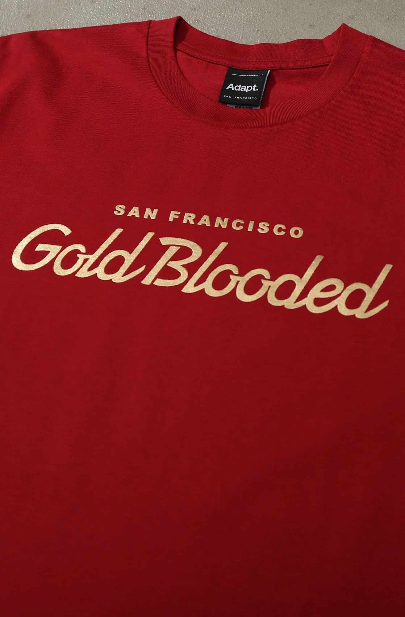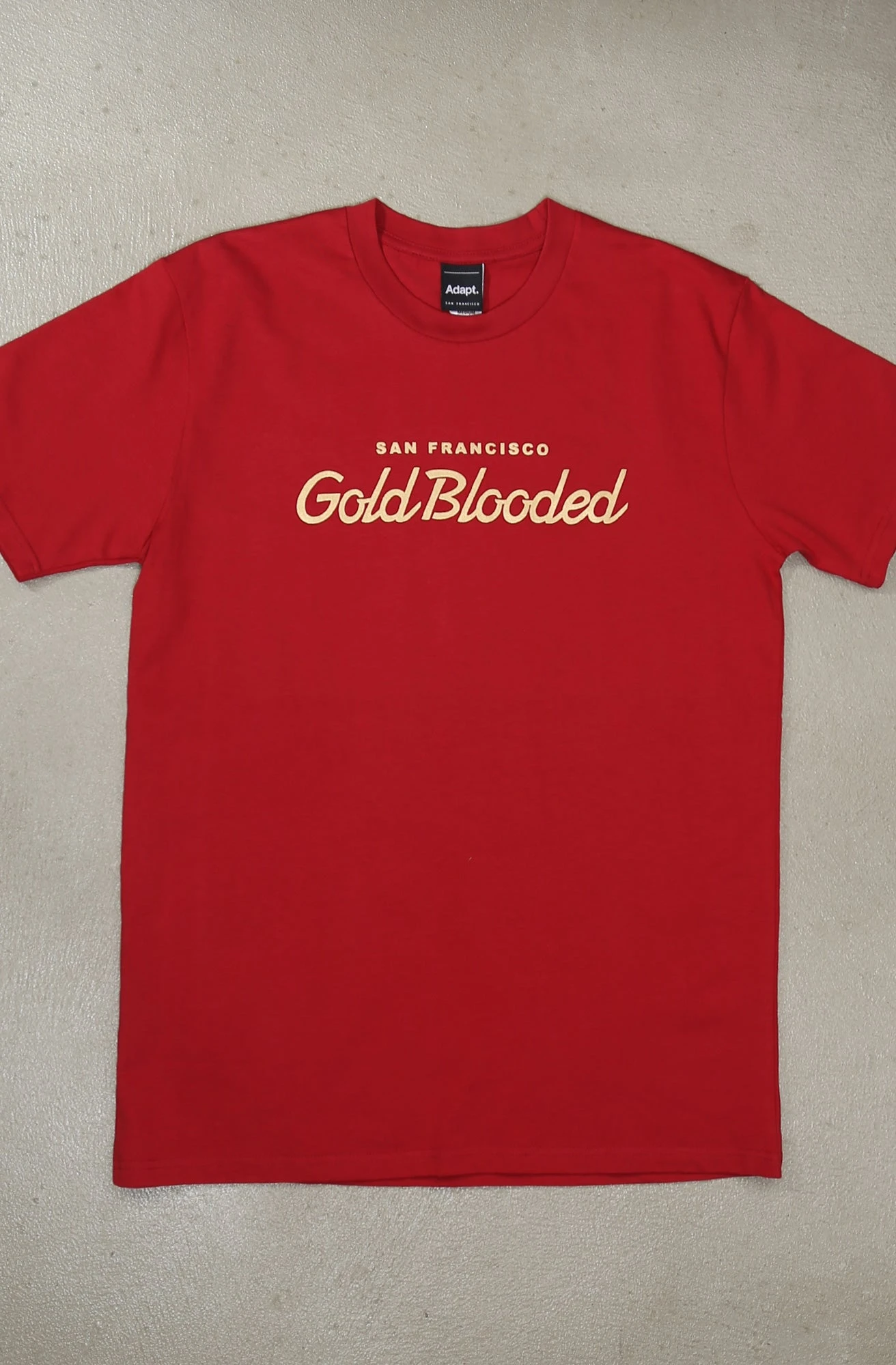 Gold Blooded Script (Men’s Cardinal Tee)(Mt Niners Adapt Master Mens Black Tee Copy)