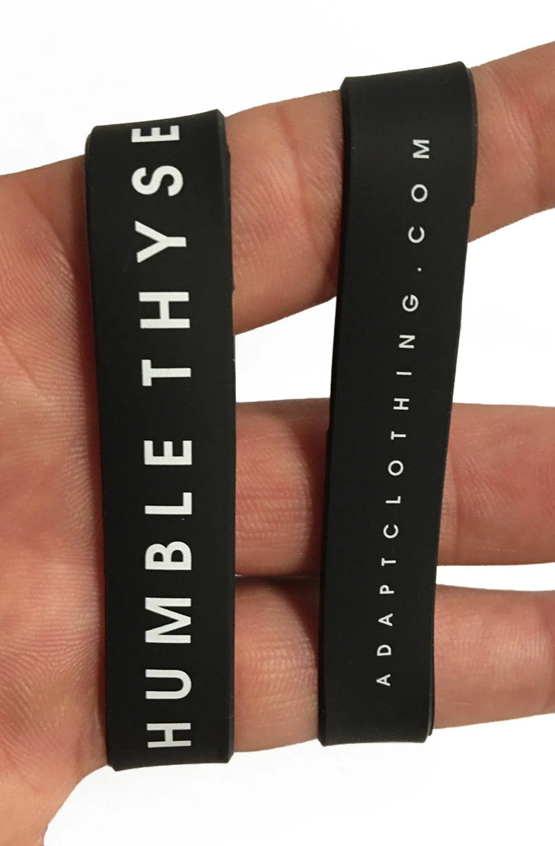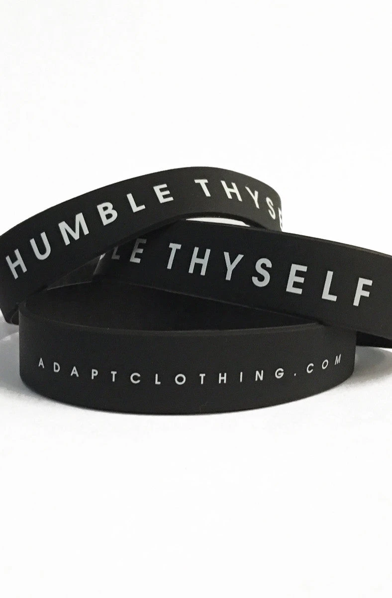 The Humble Thyself Stretch Band 3-Pack. These stretch bands are made from high-quality UV-resistant materials. Works well as a currency band, wristband, pant strap, journal closure or whatever else you can think of. Bands are semi-translucent when held up to the light. Note that these are thinner/stretchier than Livestrong-style bands. Text around band reads ‘HUMBLE THYSELF’ and ‘adaptclothing.com’. 100% Made in the USA. One size.