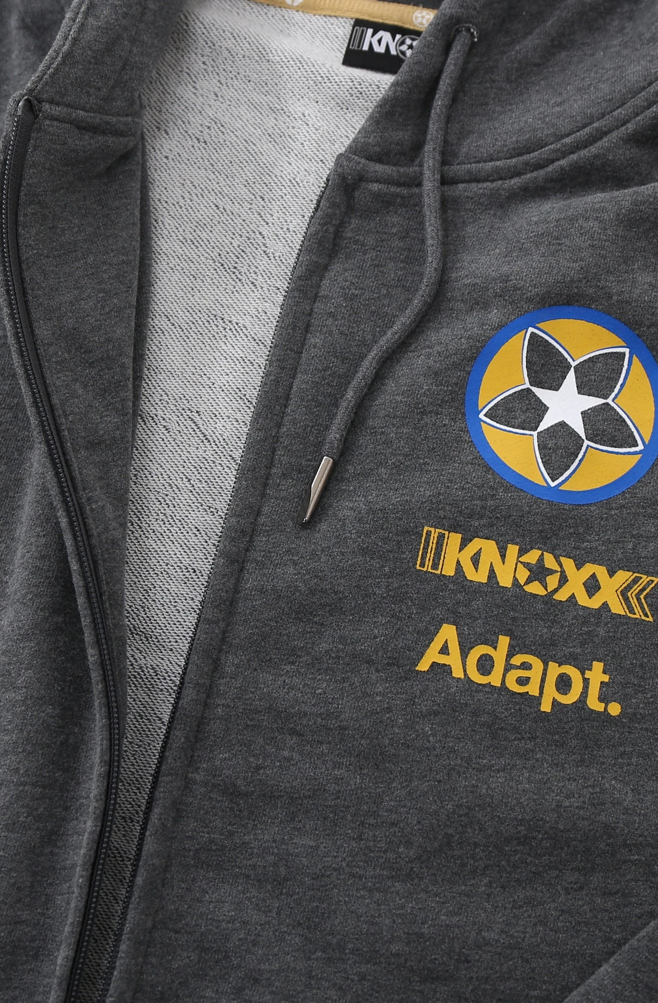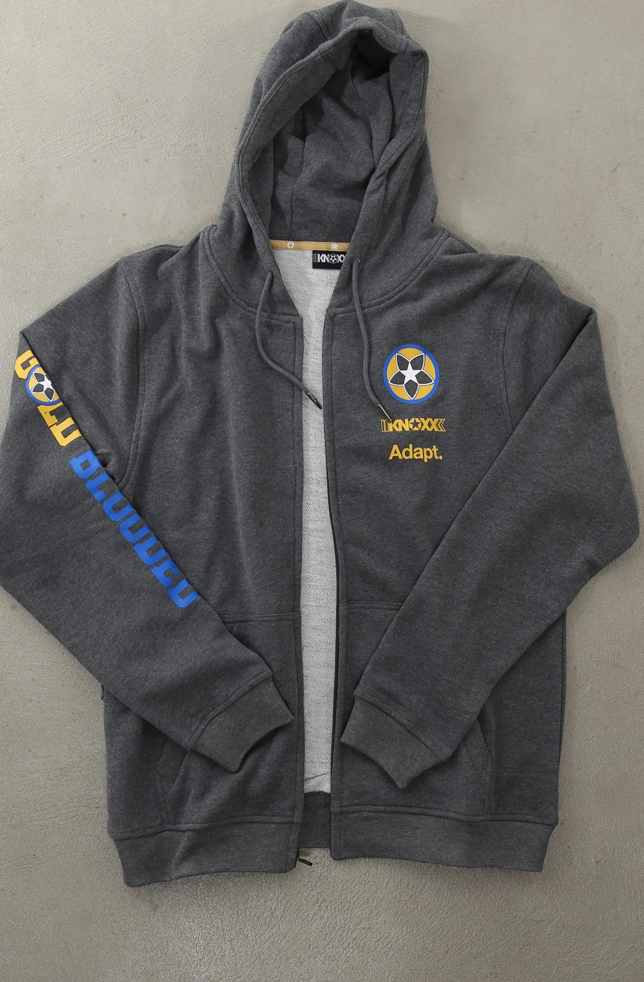 The Gold Blooded KNX A1 Zip Hoody. We’ve built this hoody from the ground up. Front full-zip YKK zipper. Split kangaroo pocket features YKK zippered closures on each end, as well as an additional hidden seam zipper pocket along the right side of the hoody to secure your smaller valuables. Premium 300GSM 70% cotton / 30% polyester construction is soft to the touch, with french terry weave lining, generous hood, and metal-tipped drawstring cords.