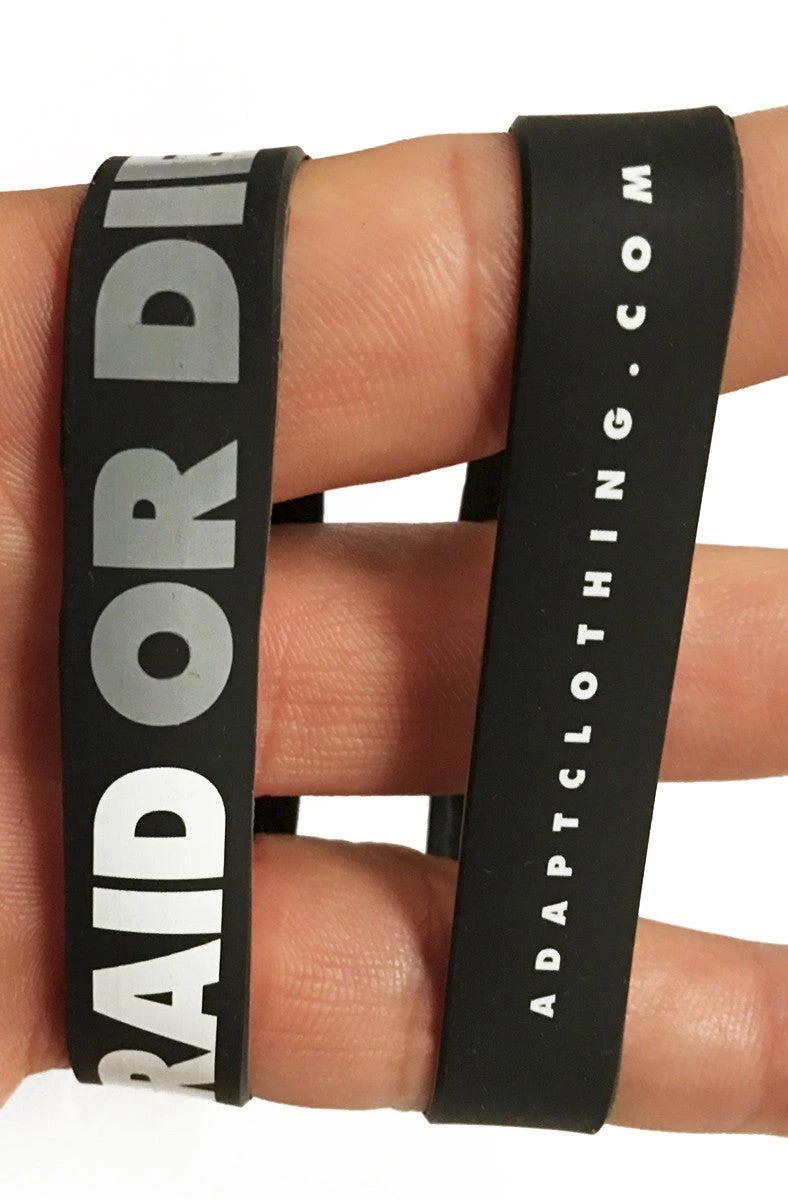 The Raid Or Die Stretch Band 3-Pack. These stretch bands are made from high-quality UV-resistant materials. Works well as a currency band, wristband, pant strap, journal closure or whatever else you can think of. Bands are semi-translucent when held up to the light. Note that these are thinner/stretchier than Livestrong-style bands. Text around band reads ‘RAID OR DIE’ and ‘adaptclothing.com’. 100% Made in the USA. One size.
