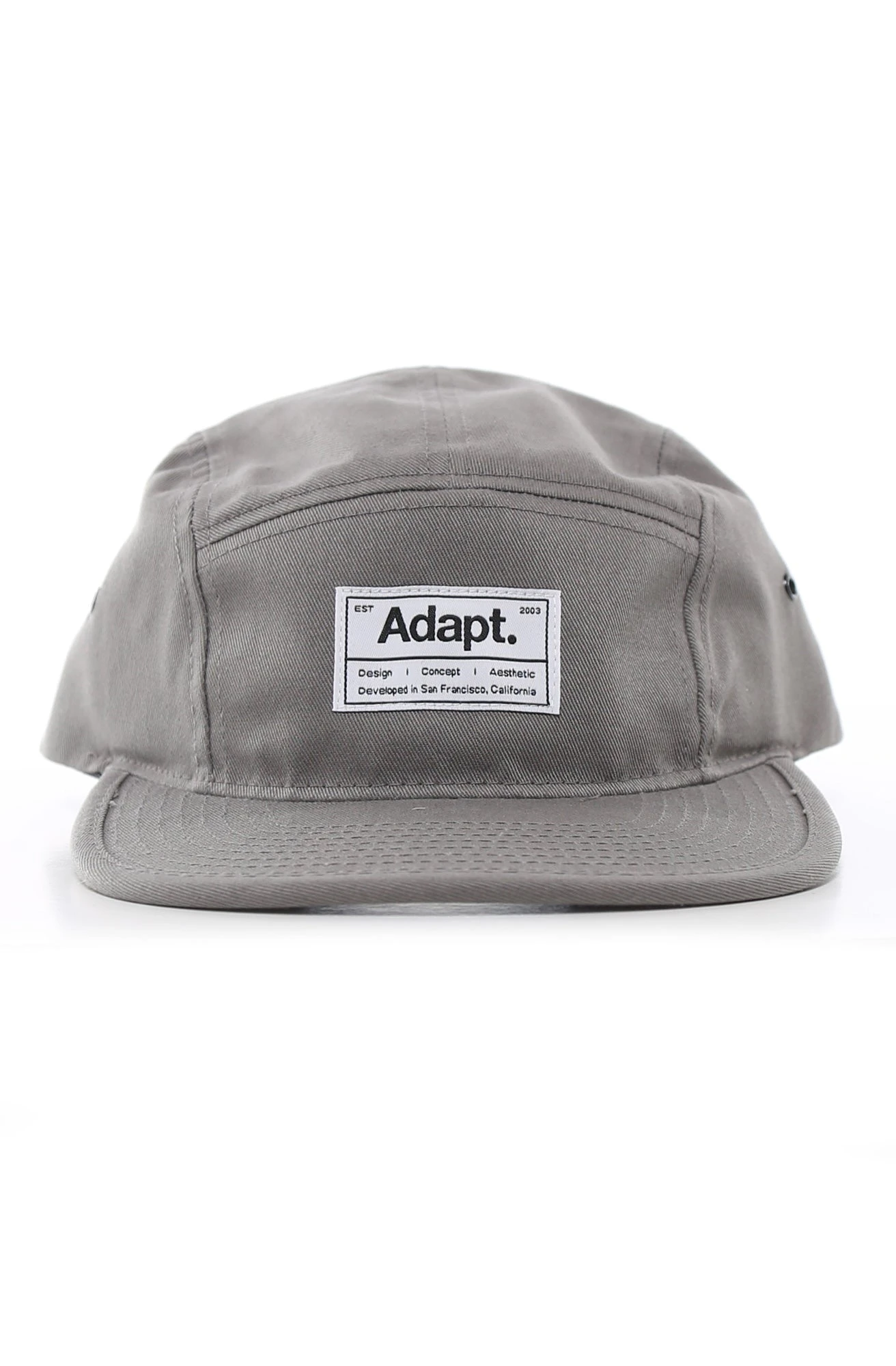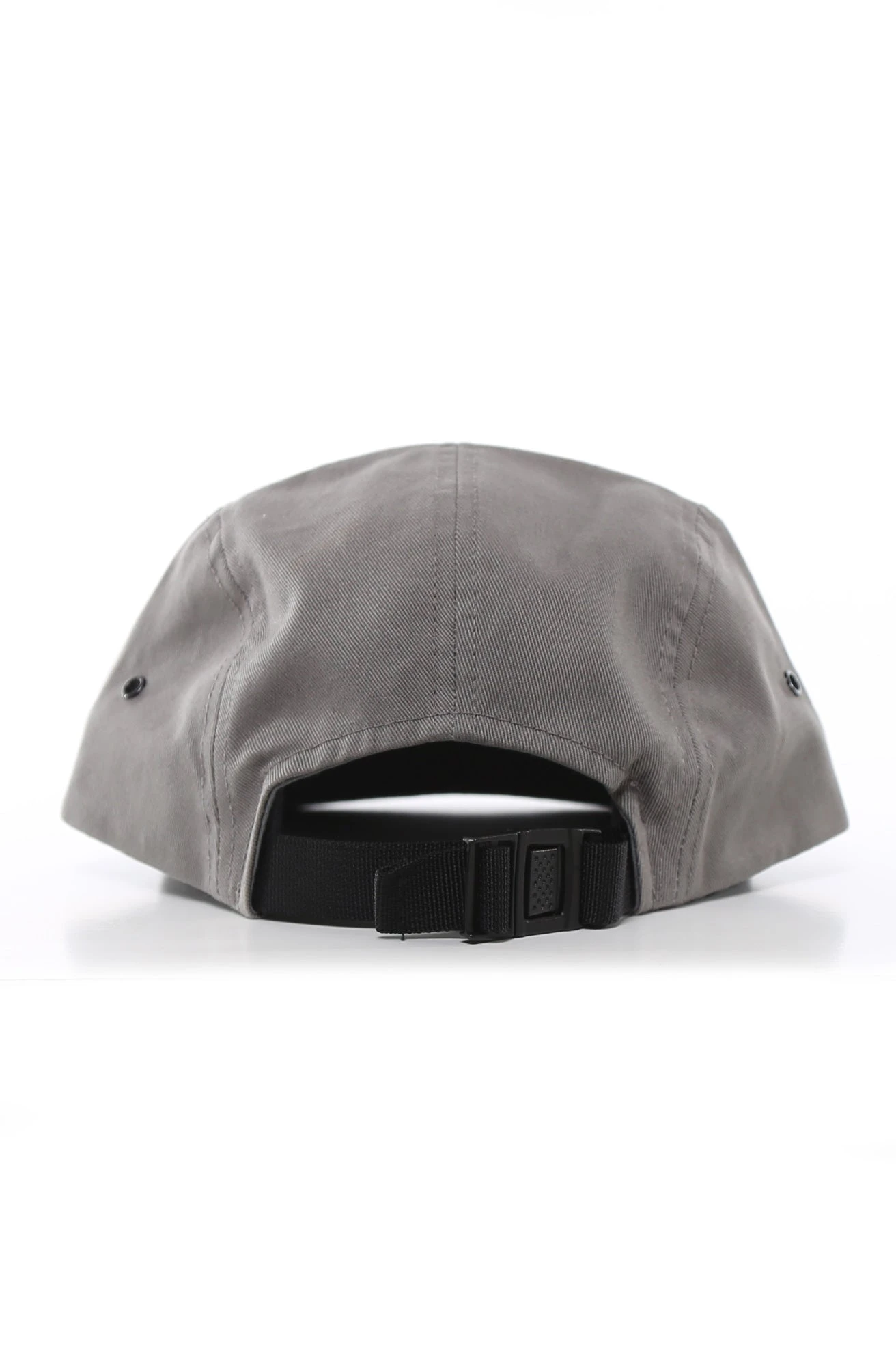 The Rio Camp Hat. Features rugged 5-panel construction upper with rectangle logo label at front and black eyelets on each side. Adjustable clip back strap.