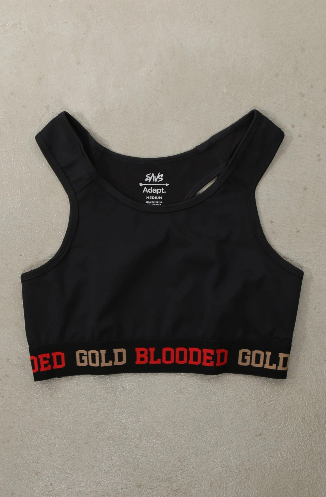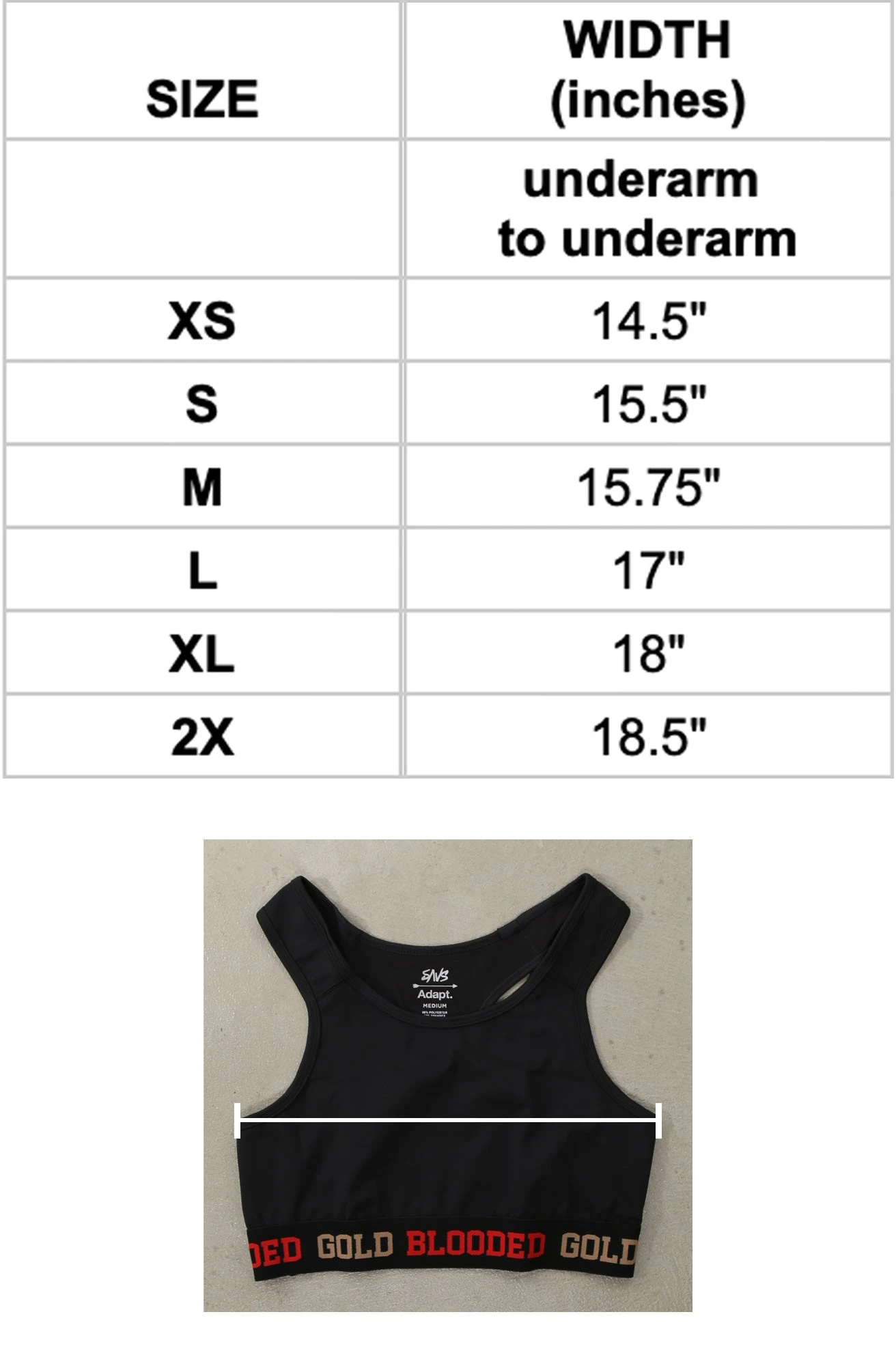 SAVS x Adapt Gold Blooded sports bra. Featuring polyester and spandex construction, these are perfect for your next gym session, run, hike, or just about anything else. See image for sizing/measurements. Because this can be worn as an undergarment product, we do not accept returns on items showing any signs of wear.